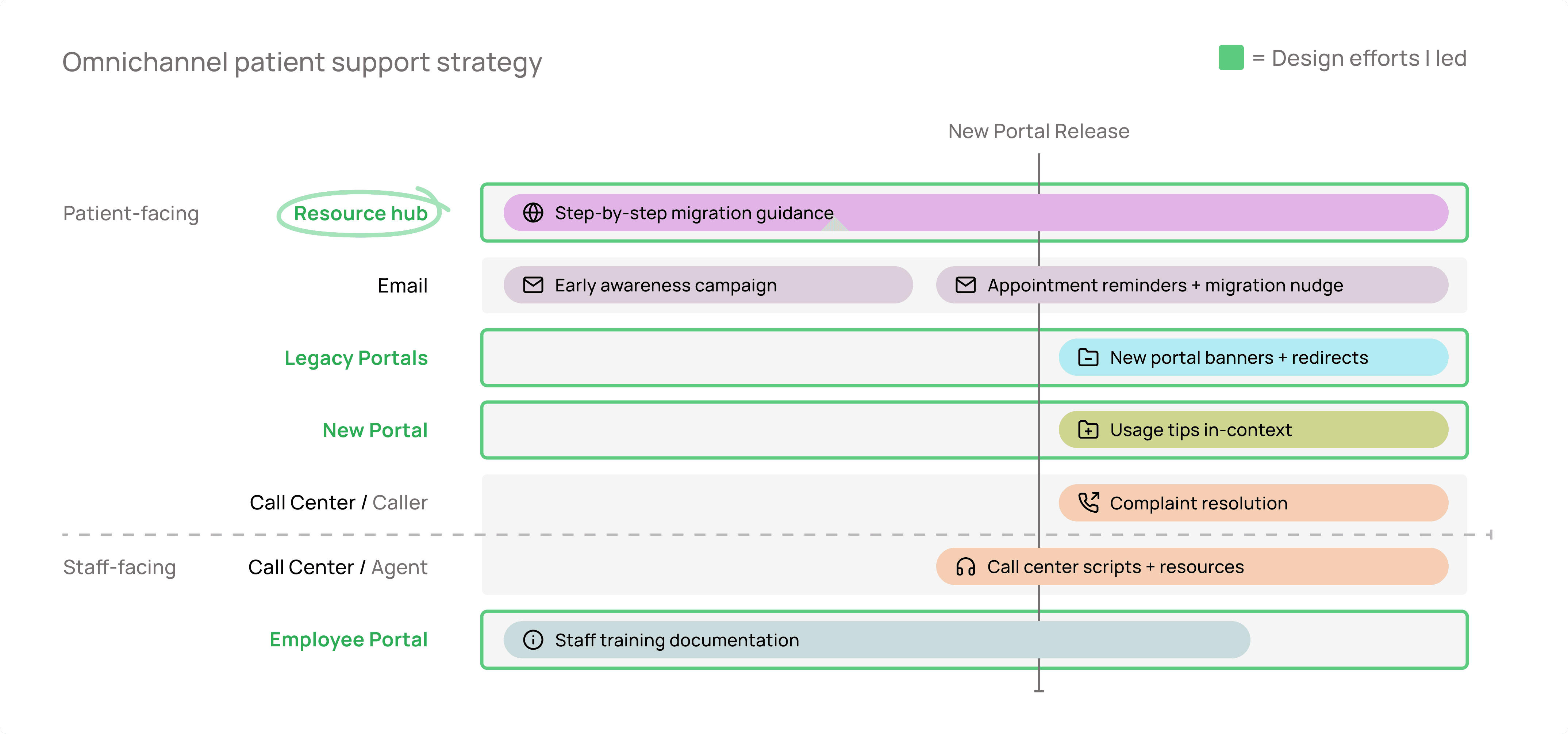 Outside of the hub, an email campaign was launched, in-app banners posted, and physical mailers sent to portal users notifying them of the changes. I had a hand in creating or leading the design of a number of these artifacts. See the blueprint below for an overview of the support strategy.