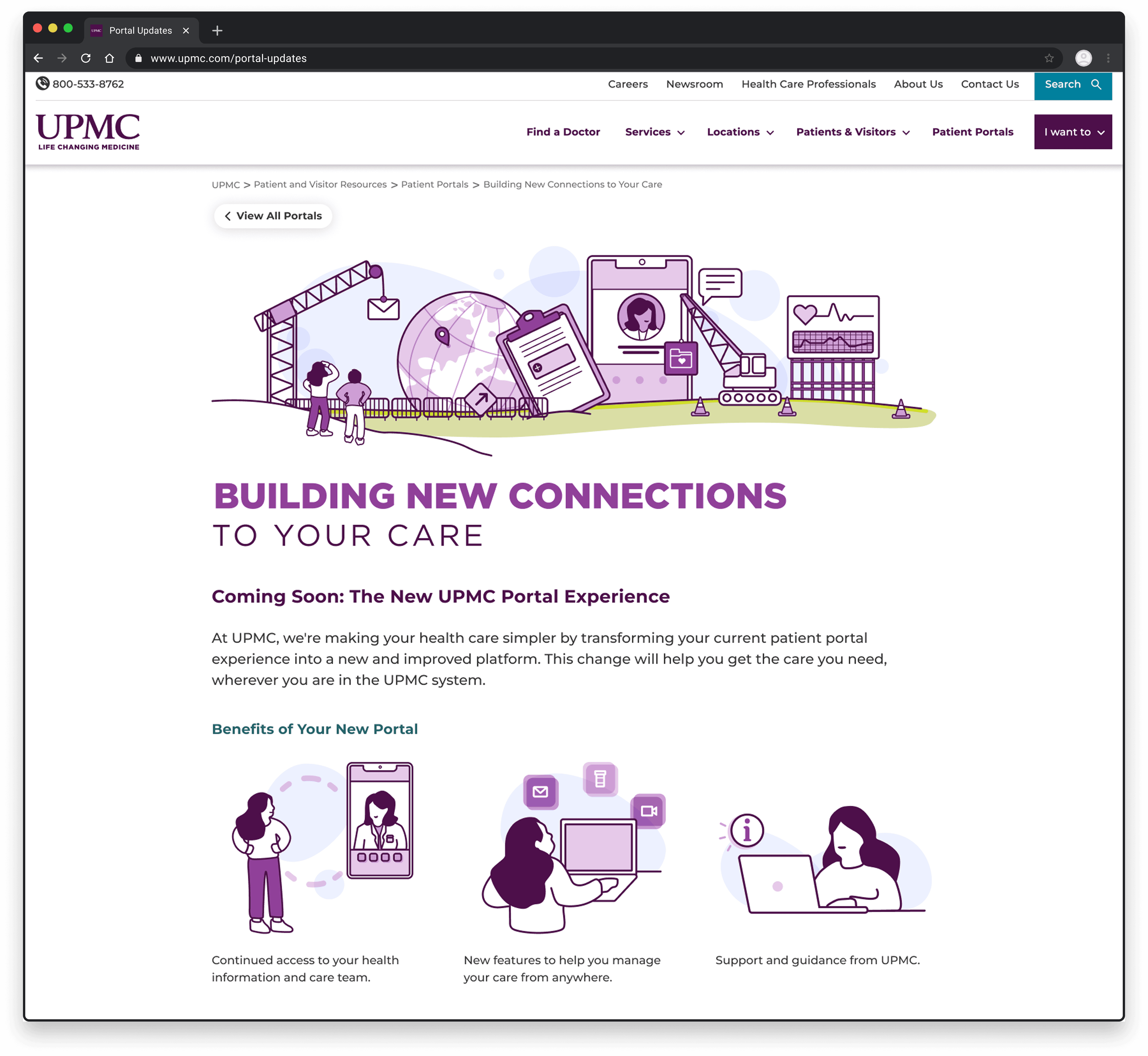 Successfully transition 3M+ portal users from 12 legacy systems to the new UPMC app. Equip patients with the info they need to understand the changes. Enable access to core portal features such as billing, scheduling, and messaging.